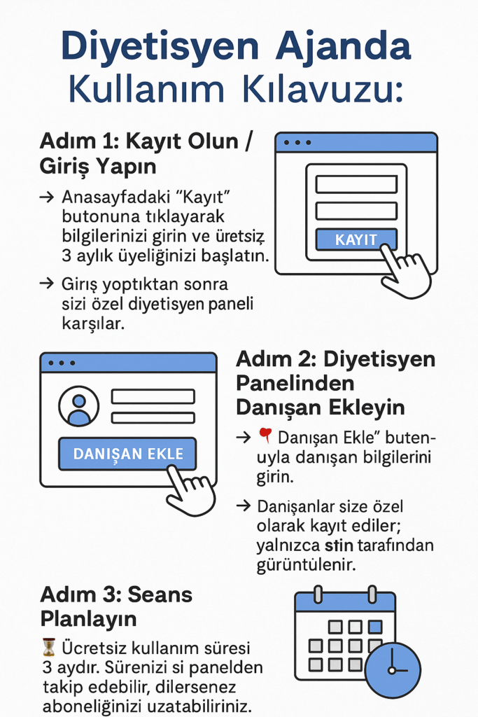 Diyetisyen Ajanda İlk 3 Ay Ücretsiz Yararlanmak için Tıklayınız (Sonrasında Aylık 100 TL, Yıllık 1.000 TL)